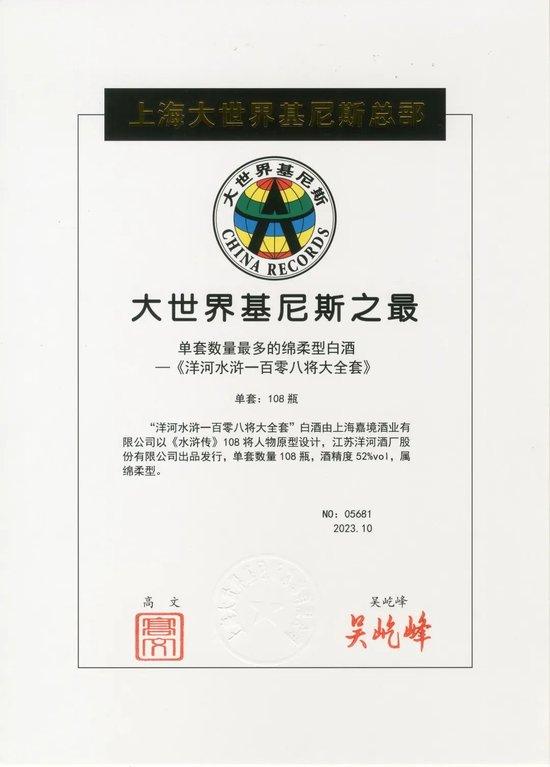 云酒说|2023-11-15据洋河官方消息,洋河从《水浒传》中汲取灵感,出品生产了“洋河水浒一百零八将大全套”系列产品,并在近日以单套数量最多的绵柔型白酒荣获“大世界基尼斯之最”。