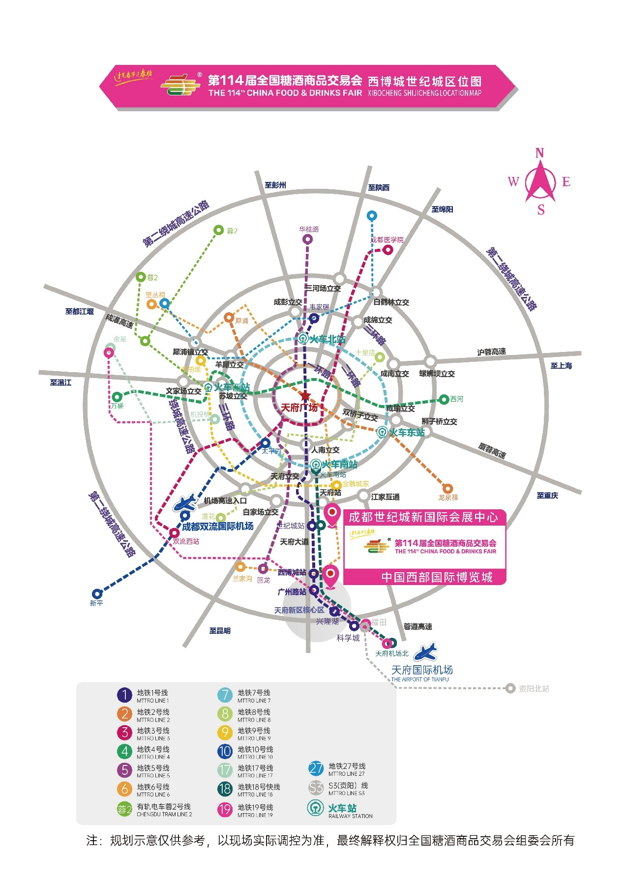 地铁:天府机场地铁站上车乘坐18号线直达西博城地铁站,参观展会请从C、E口出,票价:9元,全程约45分钟。