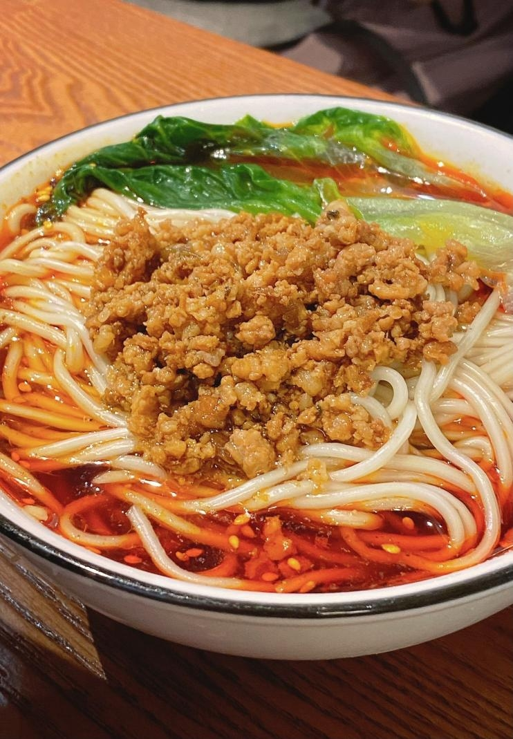 担担面:细薄的面条配上特制的肉酱、葱花、辣椒油等调料,咸香微辣,香气扑鼻,面条爽滑劲道