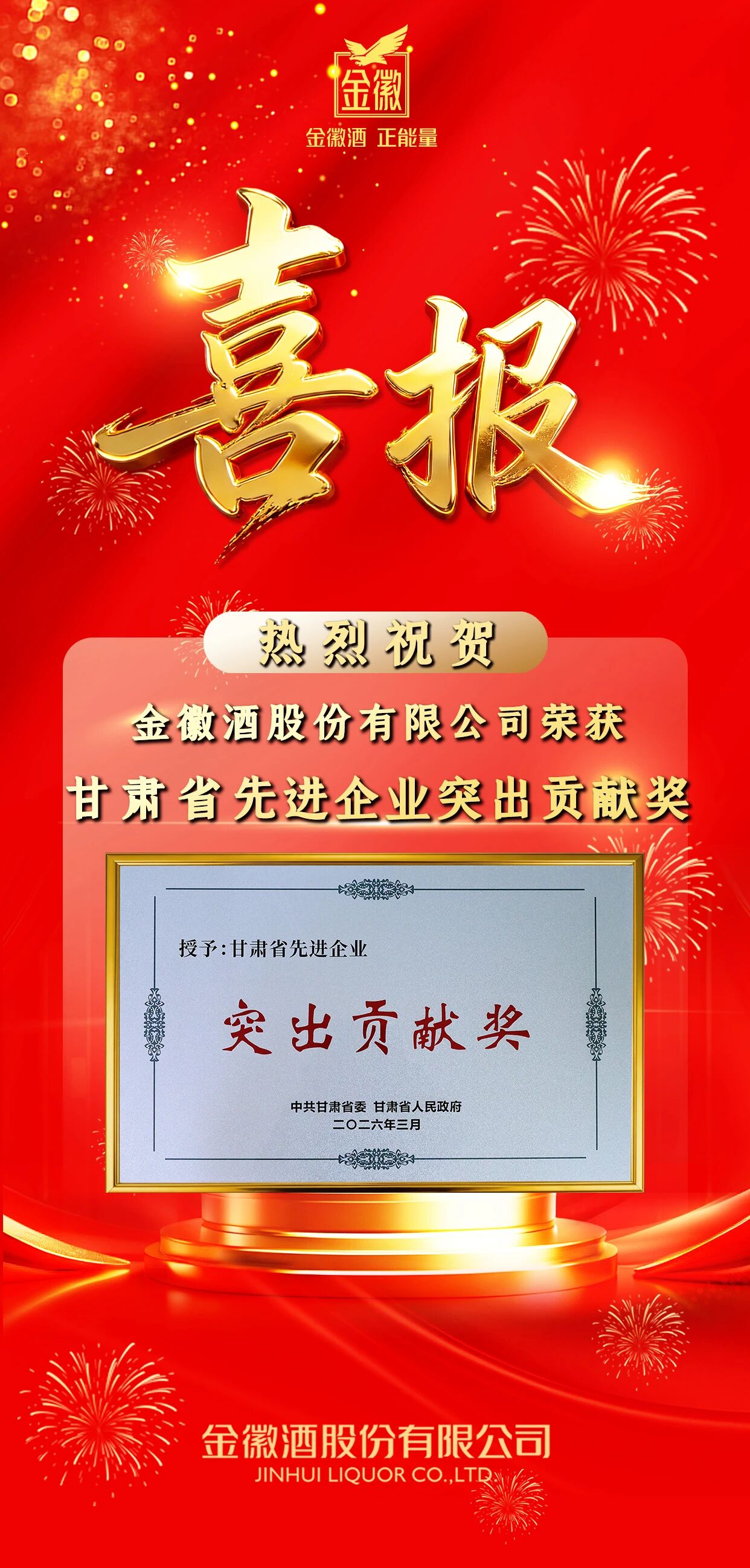云酒说|2026-04-02近日,在甘肃省委、省政府隆重召开的全省强工业大会上,金徽酒股份有限公司以高质量发展、科技创新、产业赋能及社会贡献等领域的突出表现,被授予“甘肃省先进企业突出贡献奖”殊荣。这一荣誉不仅是对金徽酒多年来深耕白酒主业、引领产业升级的高度认可,更是对公司作为陇酒领军企业持续赋能地方经济、推动工业高质量发展的充分肯定。