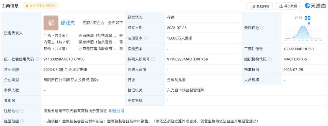 资料显示,燕京包装制品(河北)有限公司成立于2023年7月28日,注册地位于河北省沧州市东光县,股东包含燕京啤酒与中青国弘(北京)新能源科技有限公司。